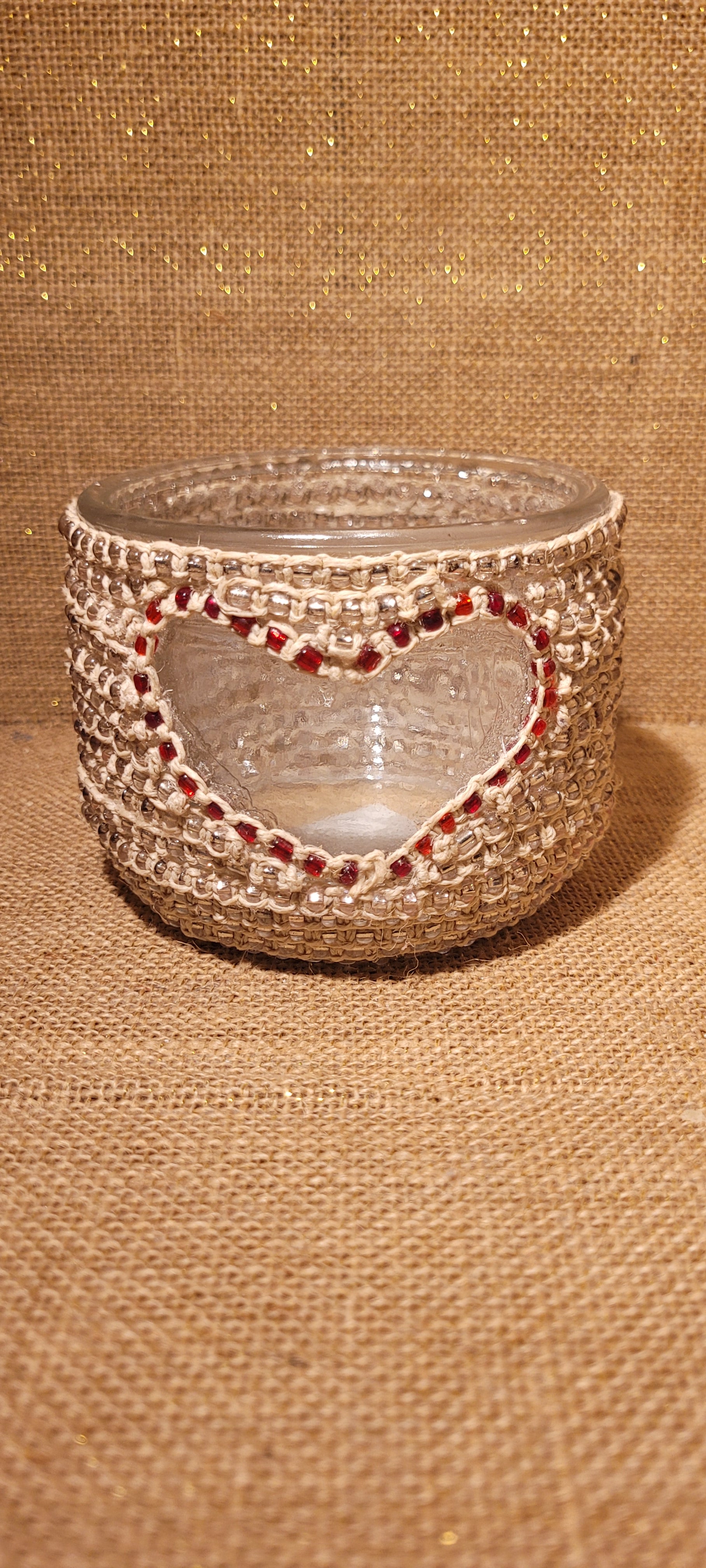 - Intricate Beadwork: Hundreds of micro-glass beads in deep red and soft pink tones are meticulously integrated into the weave. The beads are arranged to create a distinct, shimmering heart-shaped motif on the front, offering a beautiful "window" for the candle flame to glow through.