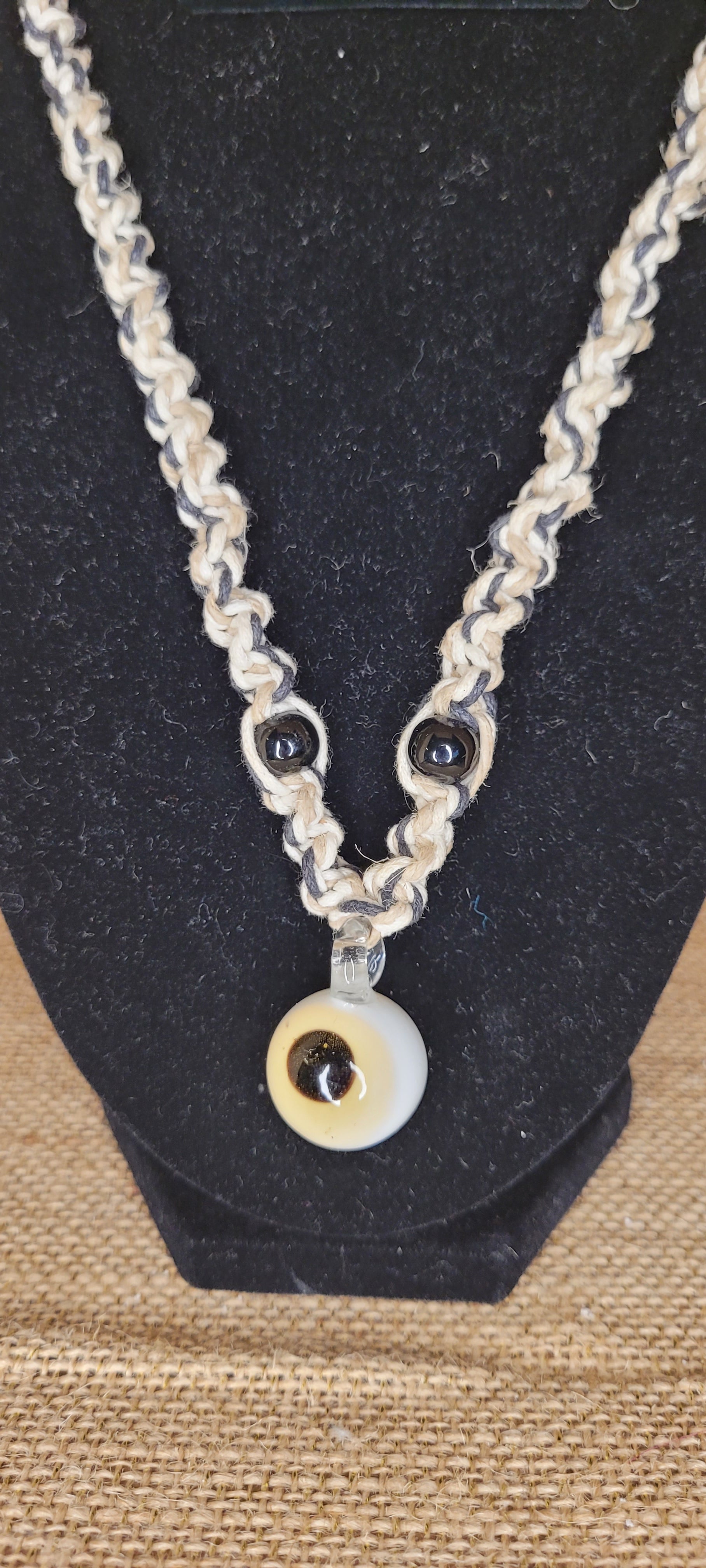 Hand-Woven Hemp and Glass Eyeball Pendant Necklace