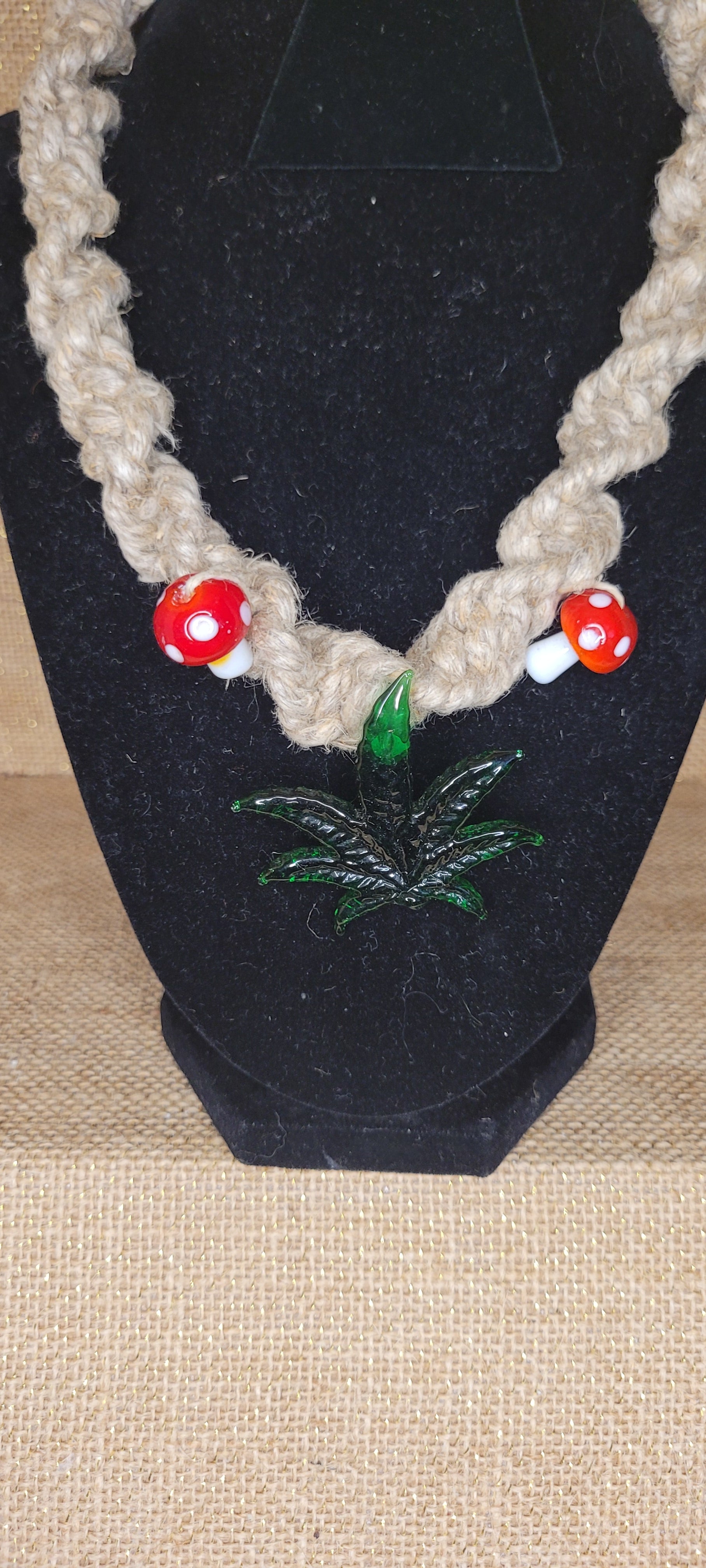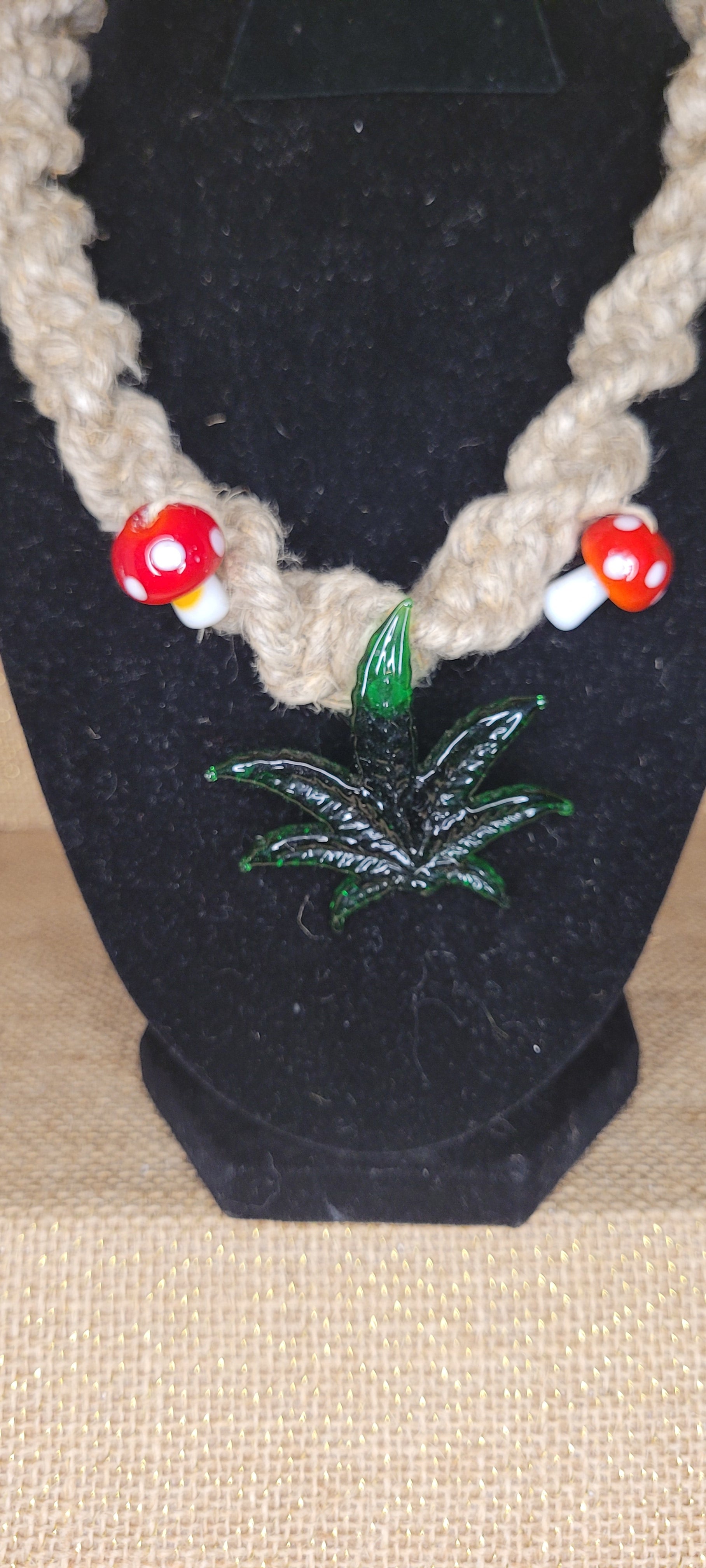 Handwoven Hemp, Glass Leaf & Mushroom Necklace