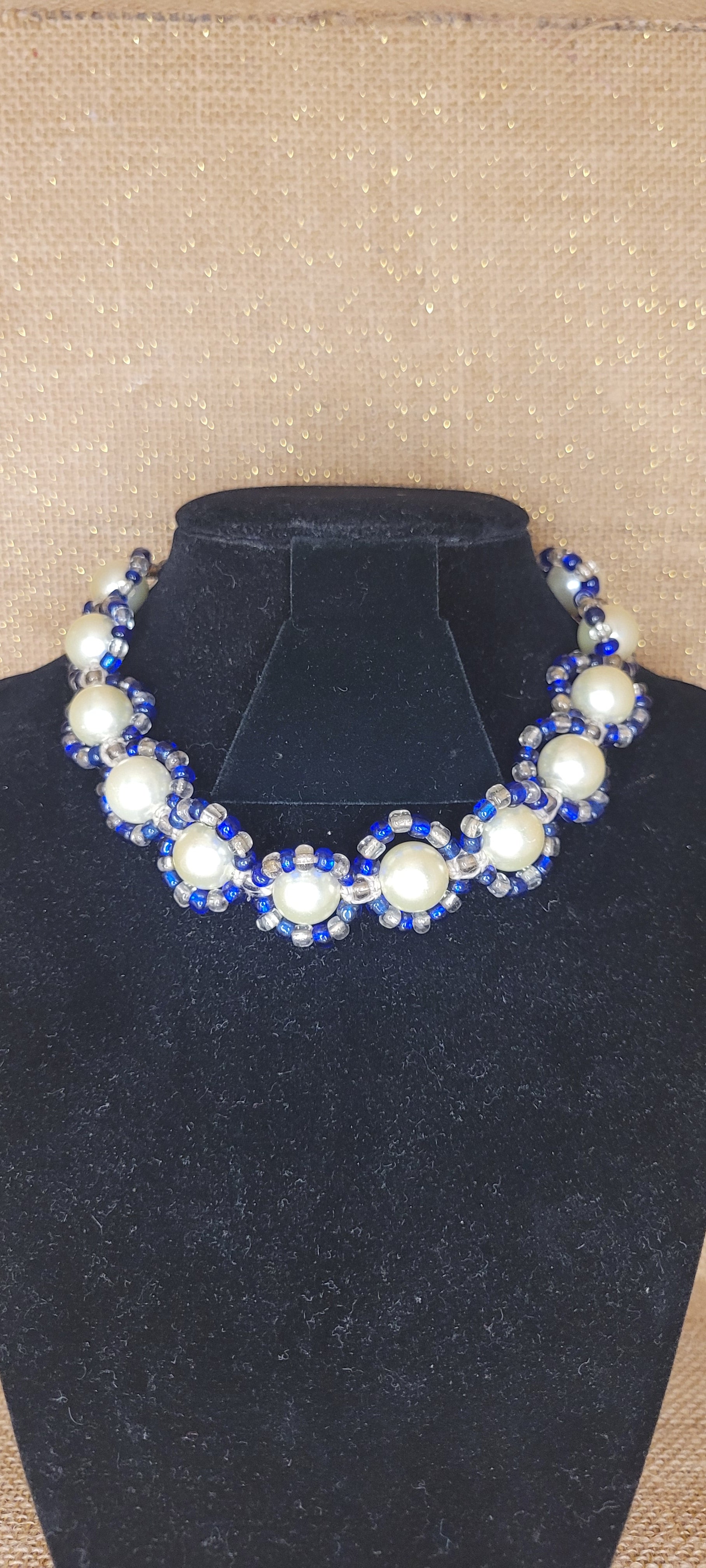 The necklace band is intricately handwoven using natural tan hemp cord as the foundation. Woven around this base are repeating clusters of large, creamy faux pearl beads. Each pearl is meticulously framed and secured by a delicate halo of small sapphire blue and clear glass seed beads, which adds a rich color contrast and subtle sparkle to the design. The weaving technique results in a substantial, collar-style necklace with a beautiful, continuous floral or scalloped pattern.