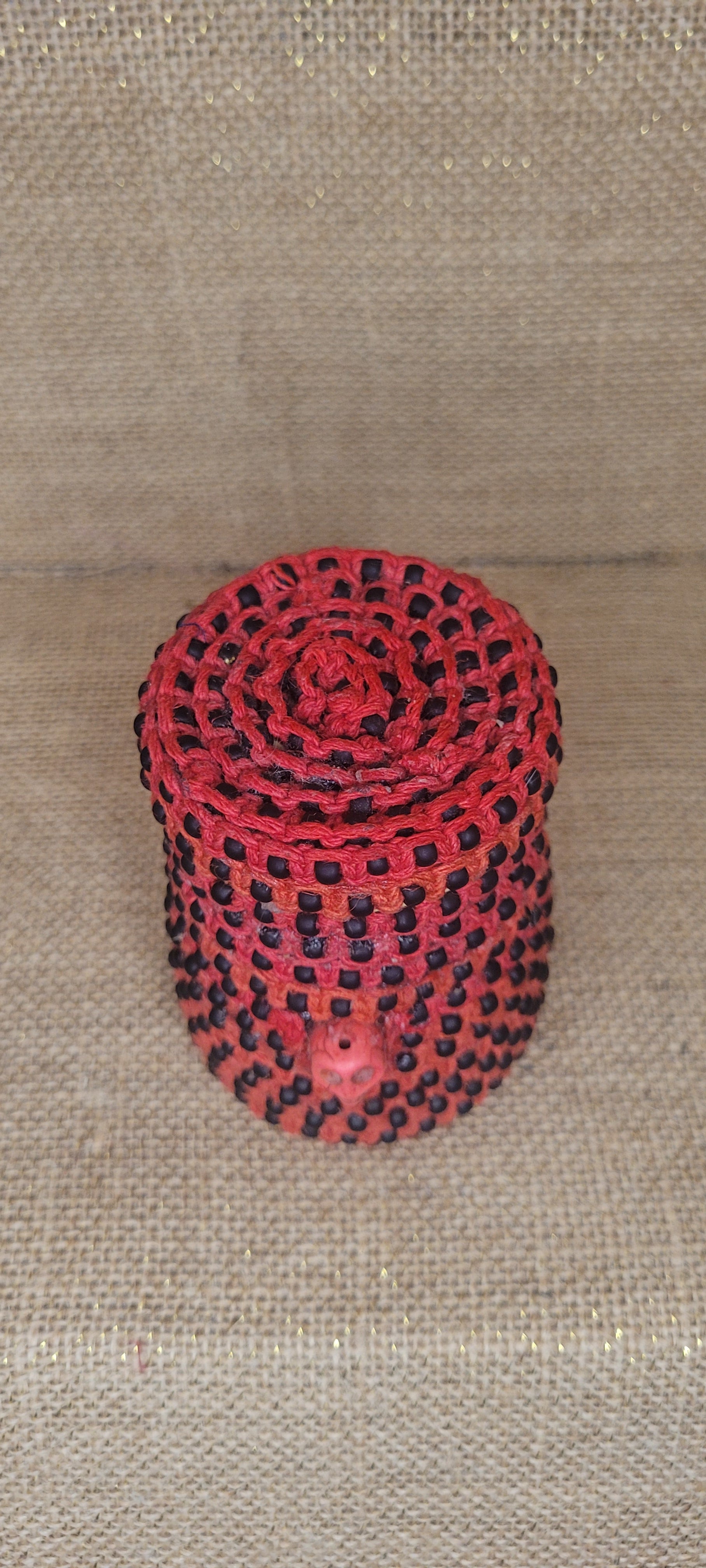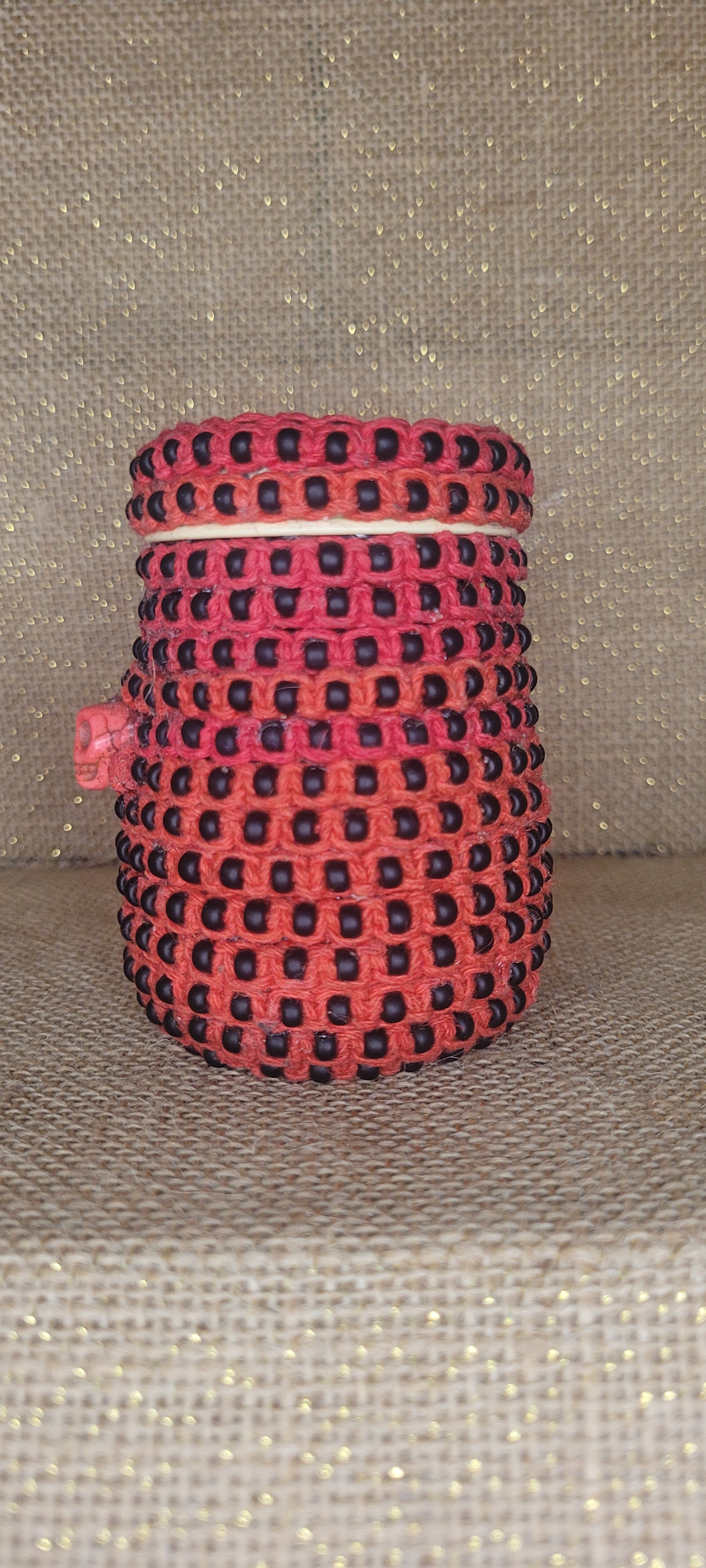 The exterior is covered entirely in vibrant red hemp rope (or natural fiber cord), with black glass beads meticulously woven into the knot pattern, creating a bold, checkered, and textured surface. This intense color combination of red and black gives the piece a strong, gothic, or edgy aesthetic.