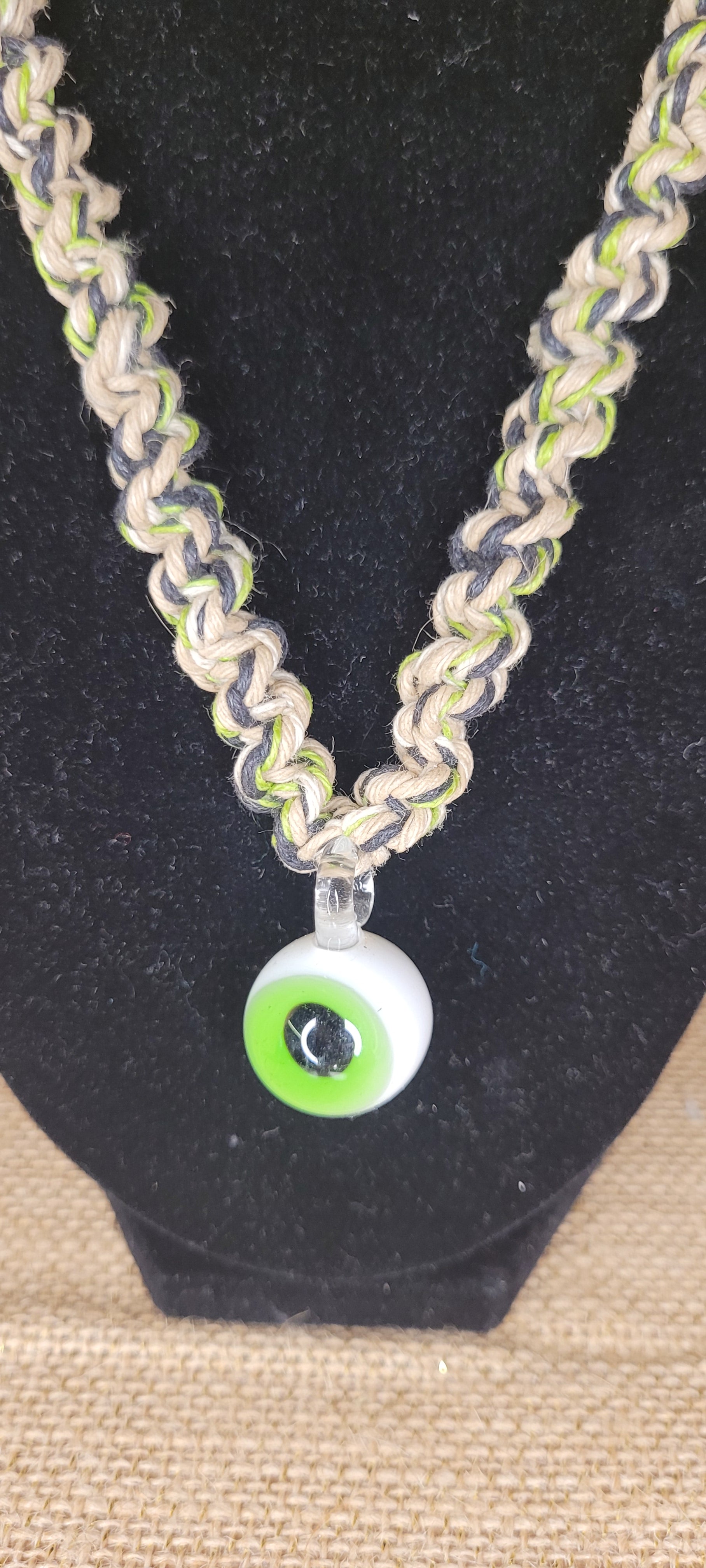 The central feature is a dramatic glass eyeball pendant. The pendant boasts a vibrant neon green iris with a dark pupil, set against a classic white sclera, giving it an intense and slightly surreal appearance. The pendant is secured to the woven chain by its integrated glass loop.